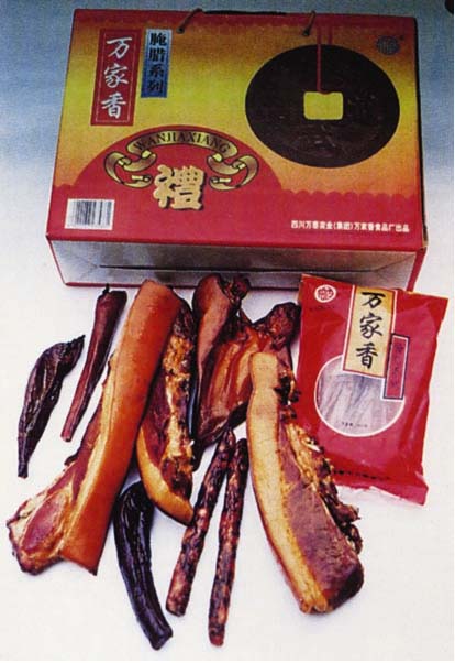 “柏香”牌畜禽特色香腊制品系万家香食品总厂采购金城山脉农民纯粮饲喂畜禽的精肉、内脏、头、尾等,用精盐和二十多味中草药腌制,取长年生翠柏枝,袅袅烟熏而成的系列天然绿色食品,该食品具有延年益寿之功效。万家香“柏香牌”畜禽特色香腊制品,根据不同消费者的需要,规格齐全,有普通消费者购买的散装制品,有常年保鲜的真空包装制品,也有包装古朴典雅、造型精美,馈赠亲朋好友的高档礼品盒制品。万家香畜禽特色香腊制品自1994年以来深受消费者喜爱,产品远销二十多个省市。1997年被指定为星级宾馆专用产品,1998年被指定为中南海专供产品,在历次商展中屡屡获奖。